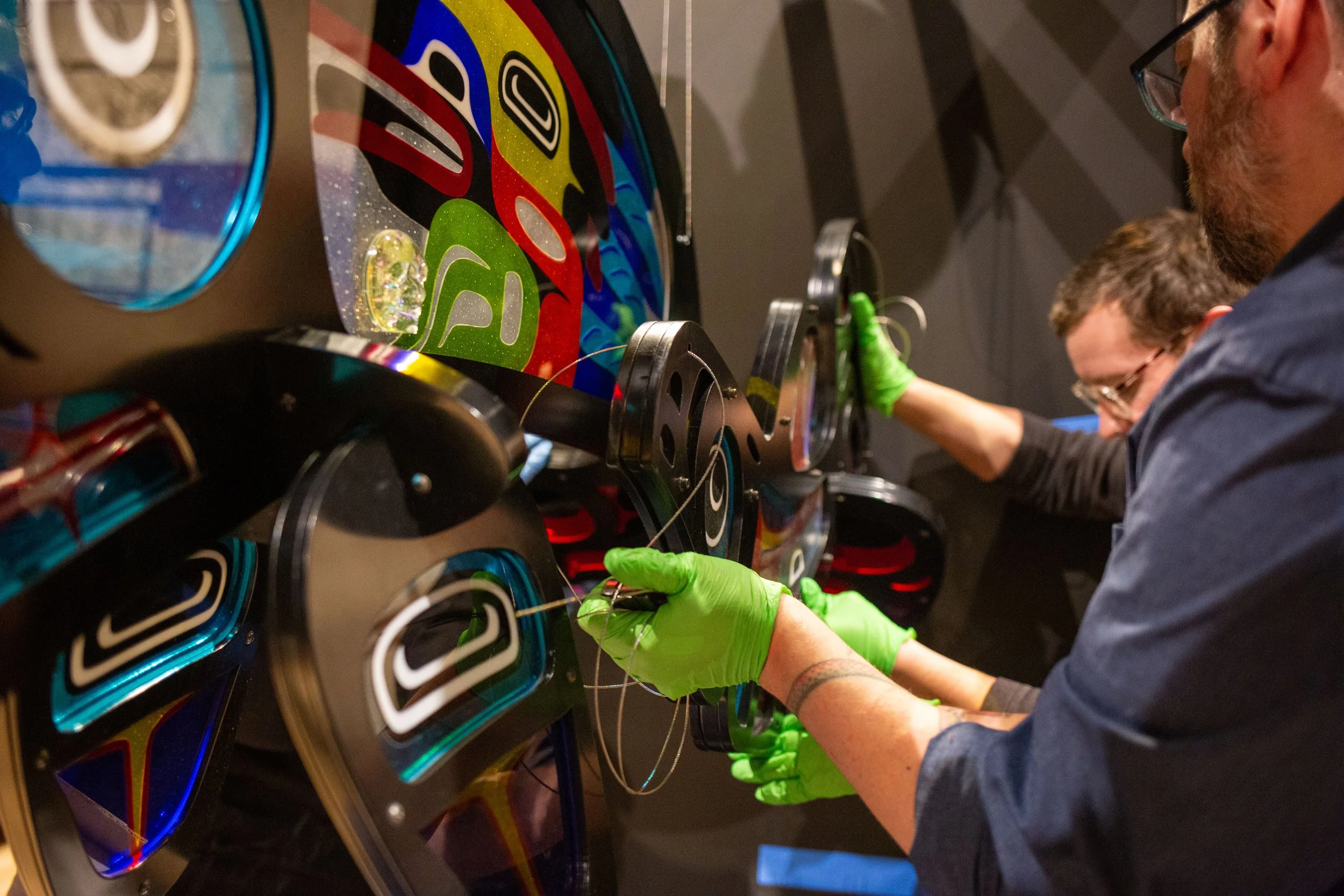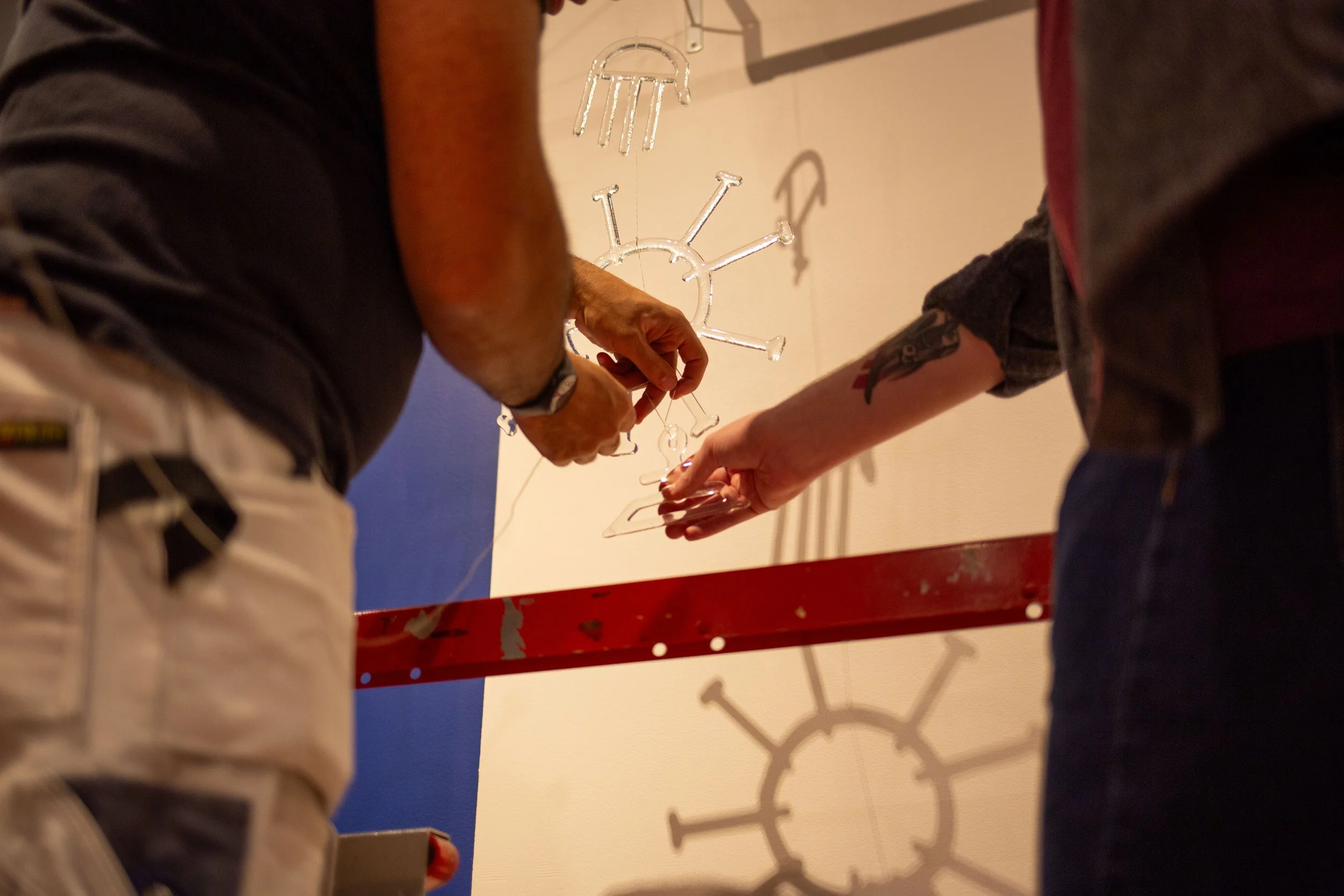 The second challenging installation was Mystical Journey Prototype by Marvin Oliver (Quinault/Isleta Pueblo; 1946–2019). The piece is named Mystical Journey Prototype because it served as the prototype for a larger-scale artwork displayed at Seattle Children’s Hospital. The hanging 150-pound glass and metal framework on display at Minnetrista consists of two elements: a mother orca and her calf. Lifting and suspending such a heavy piece while ensuring proper alignment posed unique challenges. Before beginning, we devised a plan that involved using eye hooks, clips, and airplane wire. We then prepared the space by installing some of the hardware in the case while simultaneously running wires through the artwork itself. A few of us lifted the orcas while others completed the installation of the hardware at the top. Once in place, Mystical Journey Prototype was secured and posed no danger to itself, other artworks, or viewers.
