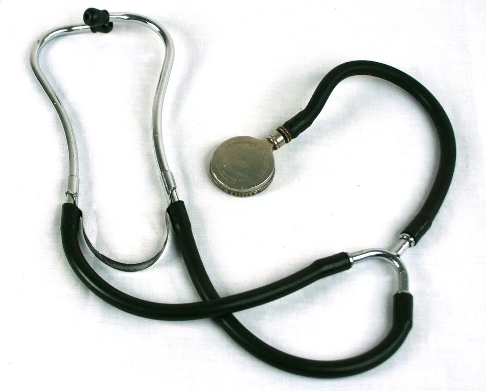 Pictured here are some of the items Dr. Phil Ball donated to the Heritage Collection from his medical career – a doctor’s bag (c. 1970) to carry medical instruments, a laryngoscope for examining the larynx or voice box, a stethoscope (c. 1955) for listening to internal body sounds, and a head mirror (c. 1960) to illuminate the ear, nose, and throat.