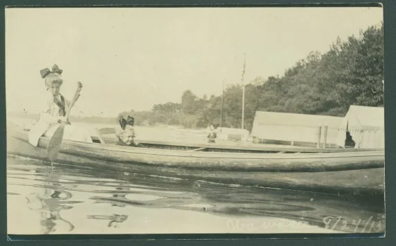 Ruth Stone and an unidentified girl in a wooden canoe on Lake Wawasee, August 24, 1913.