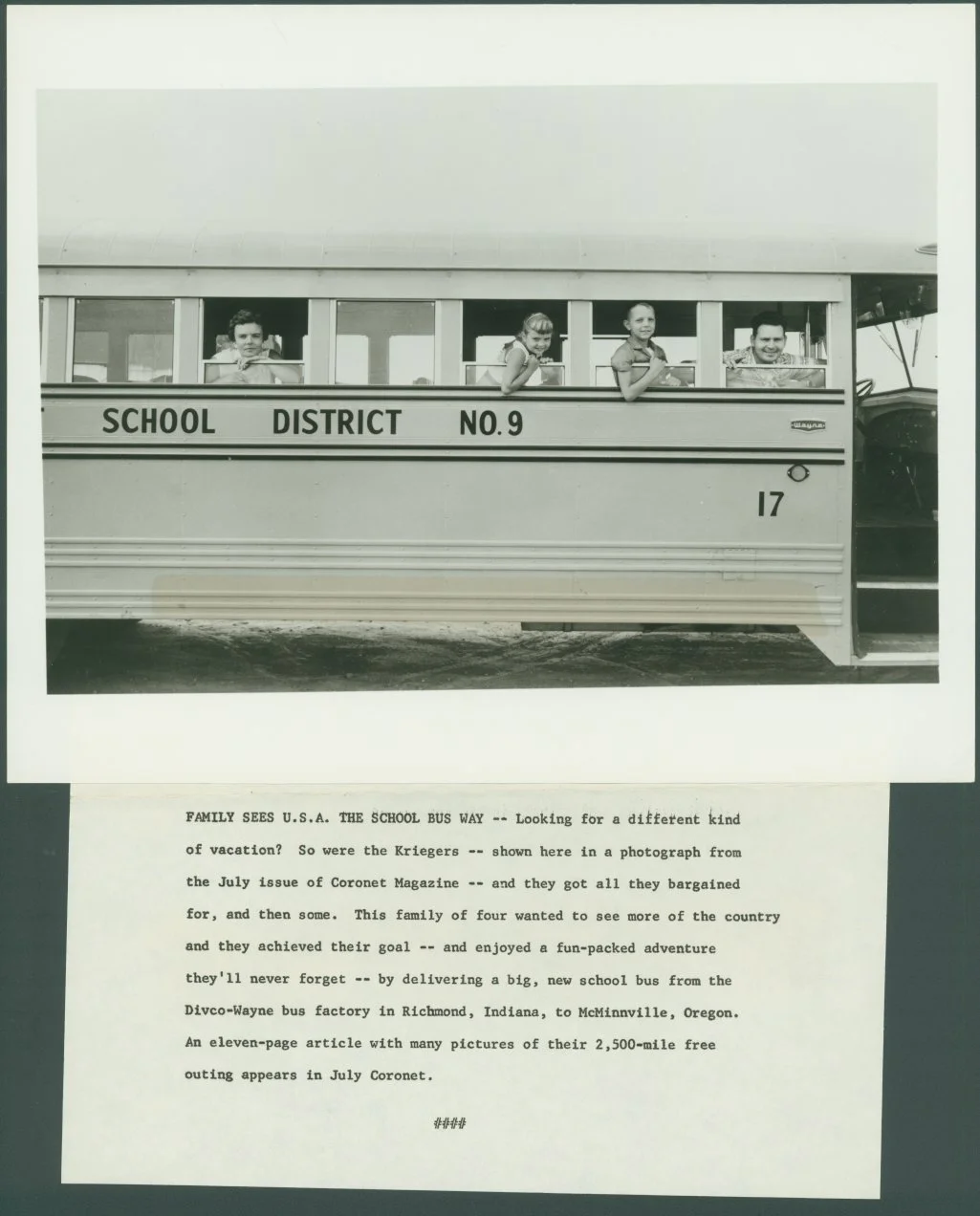 The Krieger family delivered this school bus, made at Divco-Wayne in Richmond, Ind., to McMinnville, Oreg., using the trip as their family vacation. An eleven-page article about their trip was printed in the July 1961 issue of Coronet magazine.