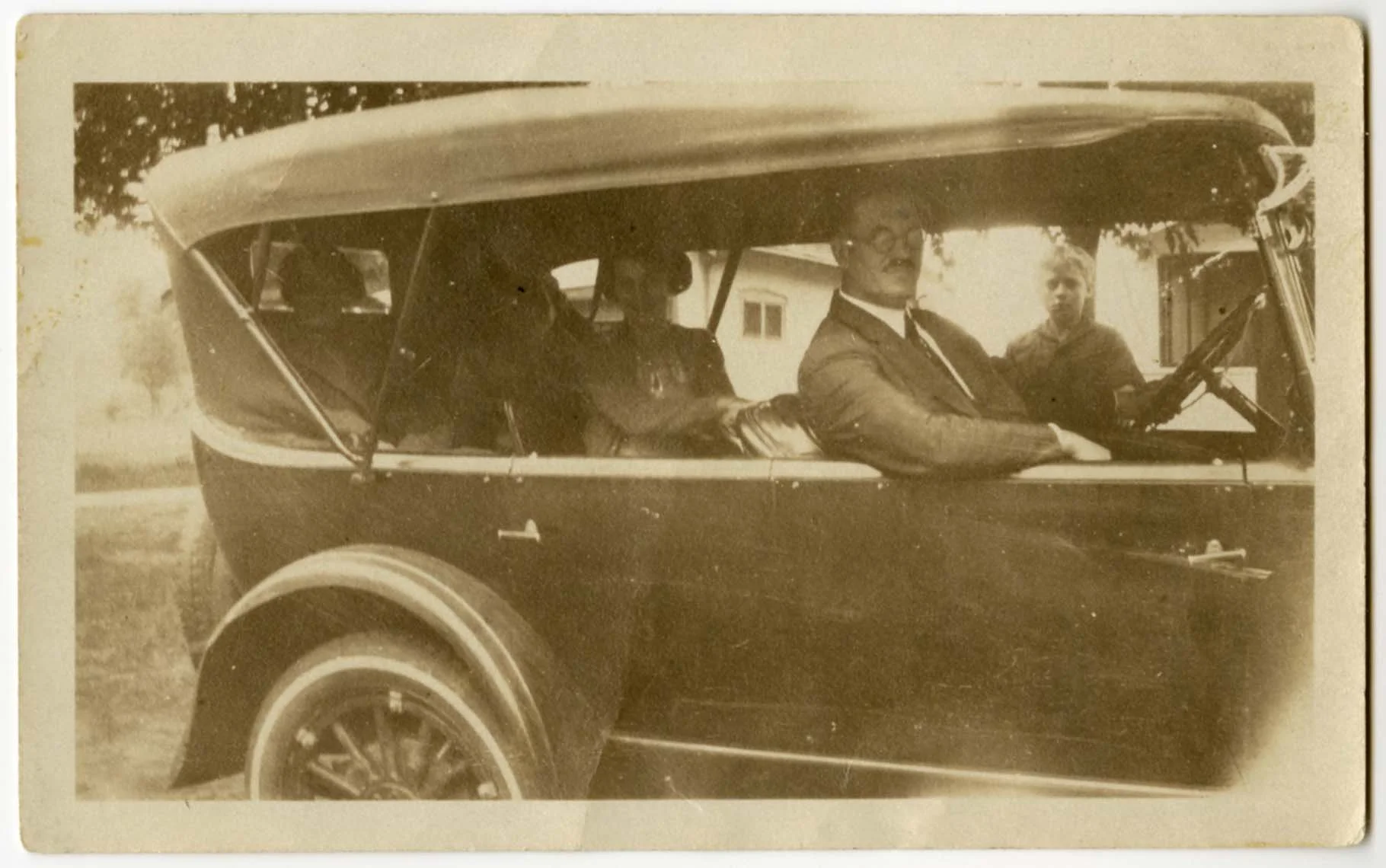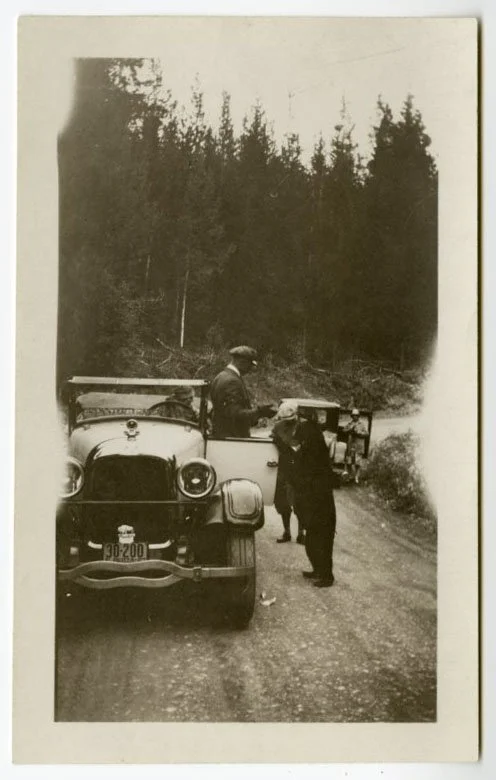 The Robinson family, driving to Pike’s Peak in a Studebaker. William O. Robinson driving, Billie and Wilhelmina in the back seat, woman in middle seat not identified. Circa 1923-1924.