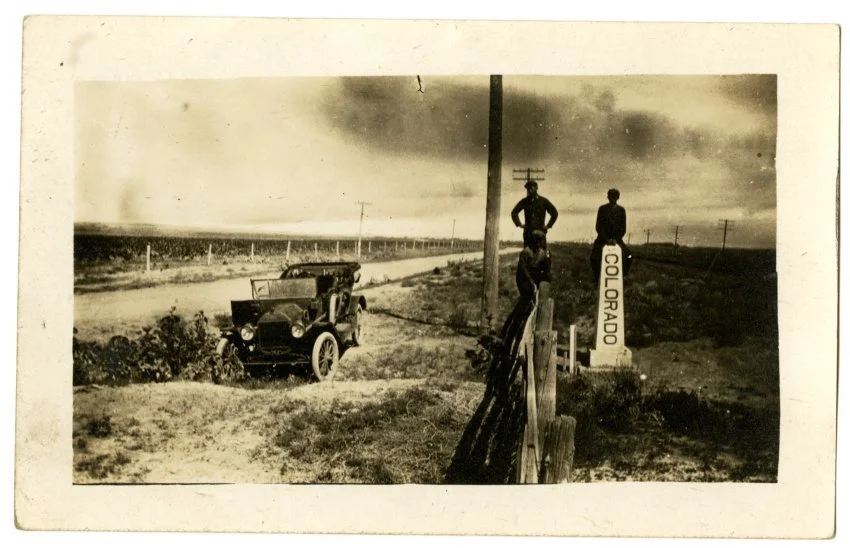 Martin Davis and two others posed near a Colorado signpost. Undated.
