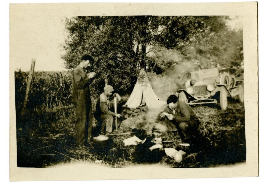 Martin Davis and two other unidentified men camping.