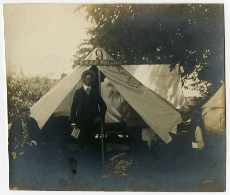 Bob Baur standing in front of his “Camp Uneeda” tent. The other two men are unidentified. Undated.